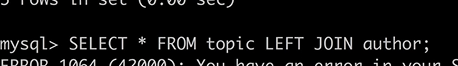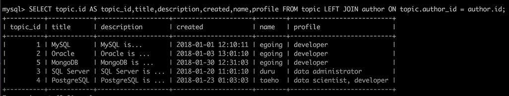 topic author 테이블을 결합하기 위해 join 명령어를 사용한다.