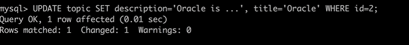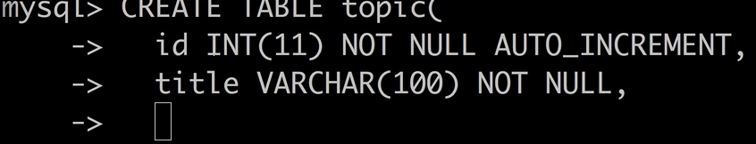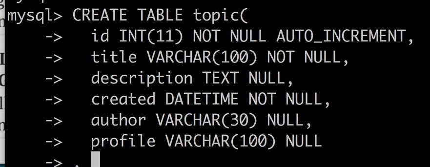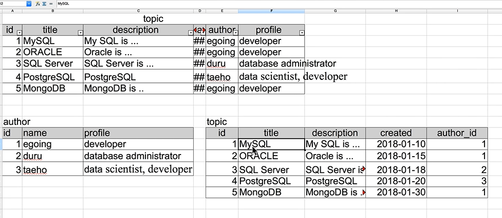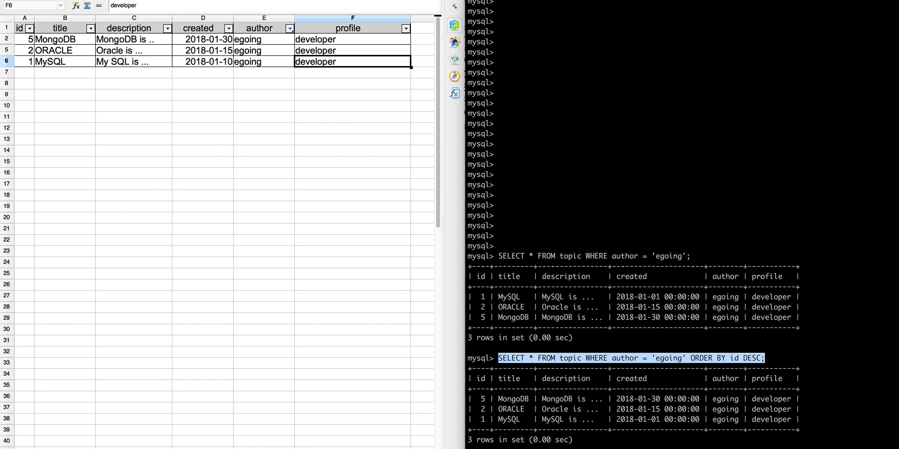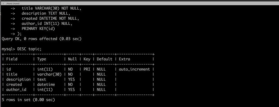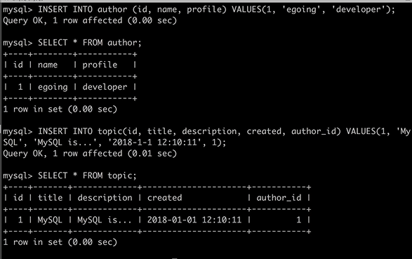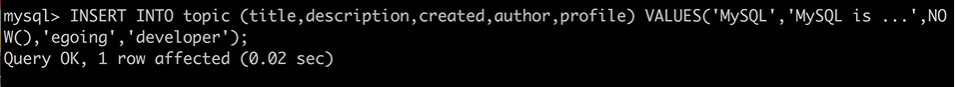 INSERT INTO topic (title,description) VALUES('MySQL', 'MySQL is ...', NOW(), 'egoing', 'developer'); 명령어를 이용해서