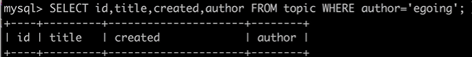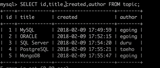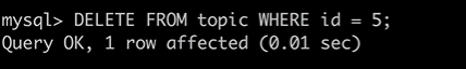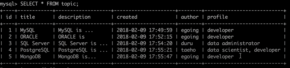 추가한 데이터 row를 읽기 위해 SELECT * FROM topic; 명령어를 입력한다.