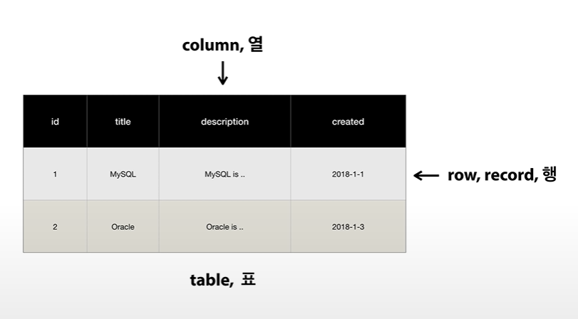 -> 데이터의 column을 얘기할 때는 데이터의 타입, 구조를 의미하고, row를 얘기할 때는 데이터 하나하나, 자체를 의미한다.