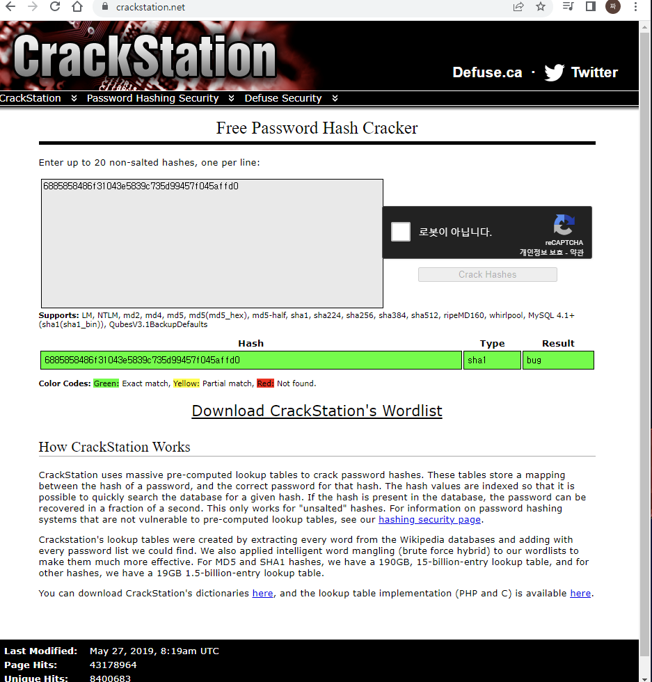 https://crackstation.net/에서 6885858486f31043e5839c735d99457f045affd0해시값을 크랙하면 아래와 같이 bug를 확인할 수 있다.