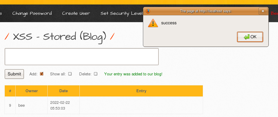 <script>alert("success");</script> 를 입력하면 경고창을 띄울 수 있다.