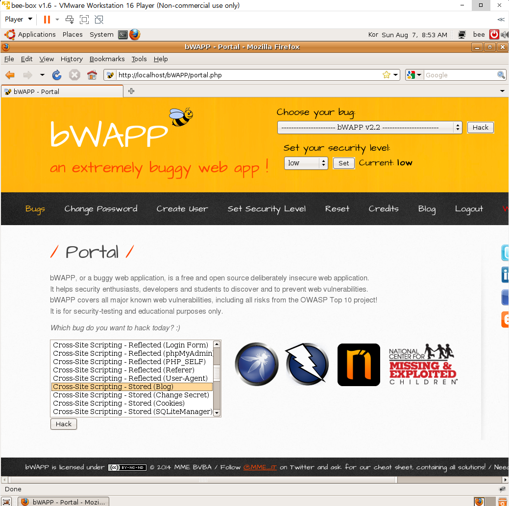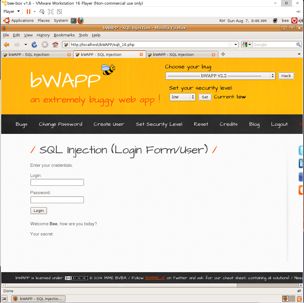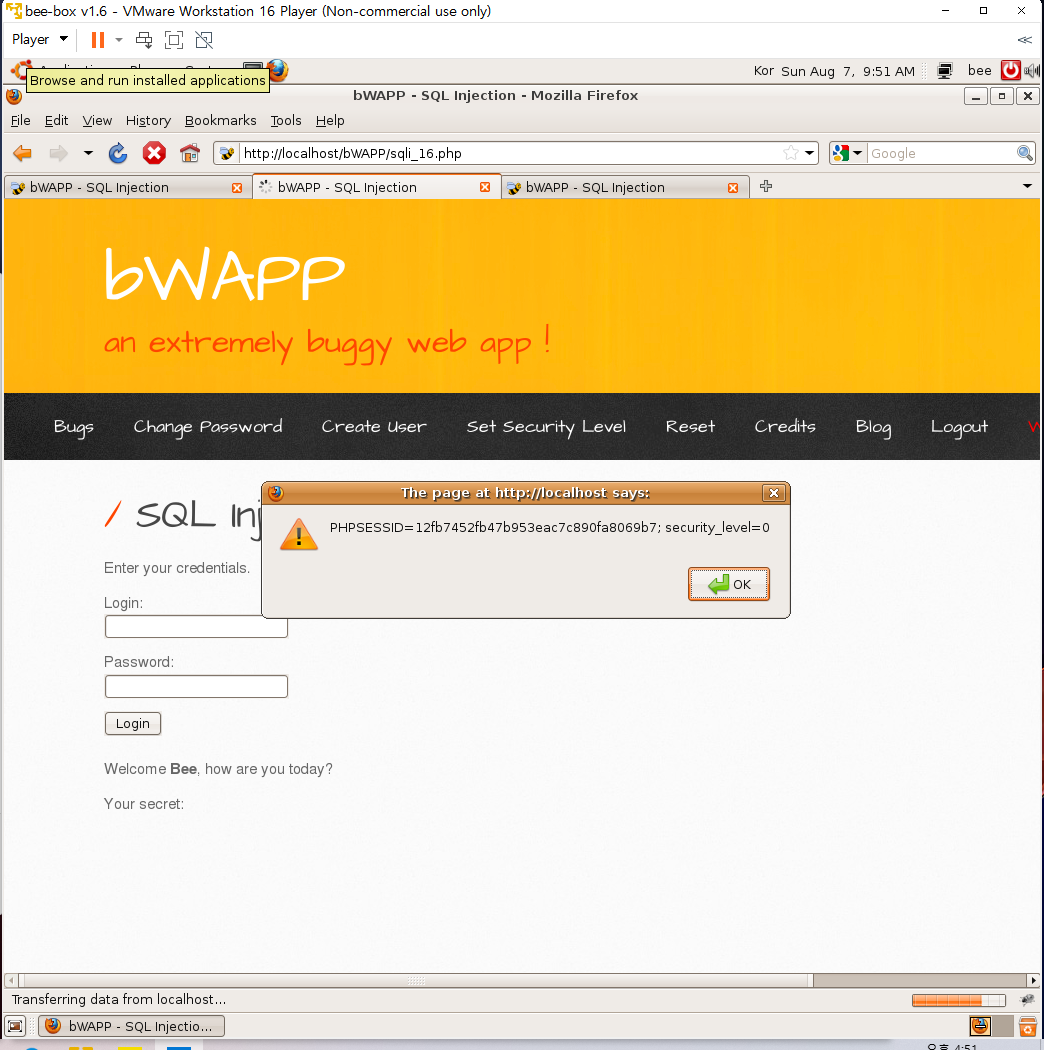 다시 sql injection(login form/user)로 가서 bee bug로 로그인하면 사용자의 쿠키 정보로 바뀌는 것을 확인할 수 있다.