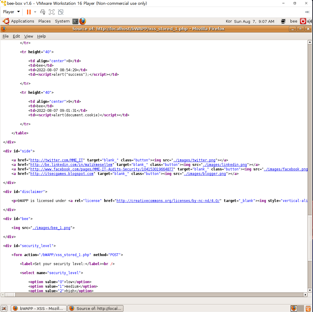 페이지 소스코드를 열어보면 이전에 작성한 <script>태그가 유효한 채로 남아있는 것을 확인할 수 있다.