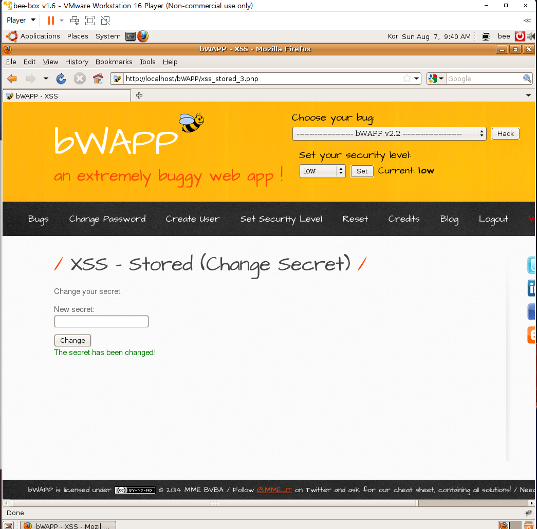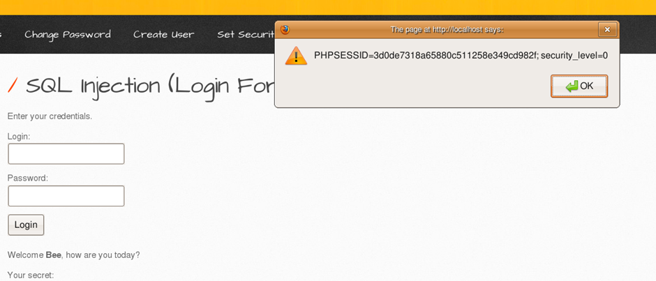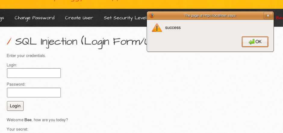 Quest. Change Secret 페이지에서 XSS 공격 후 SQL Injection(Login From/users) 페이지에서 확인할 수 있습니다. 다음 화면을 출력해보세요. (bee/bug)