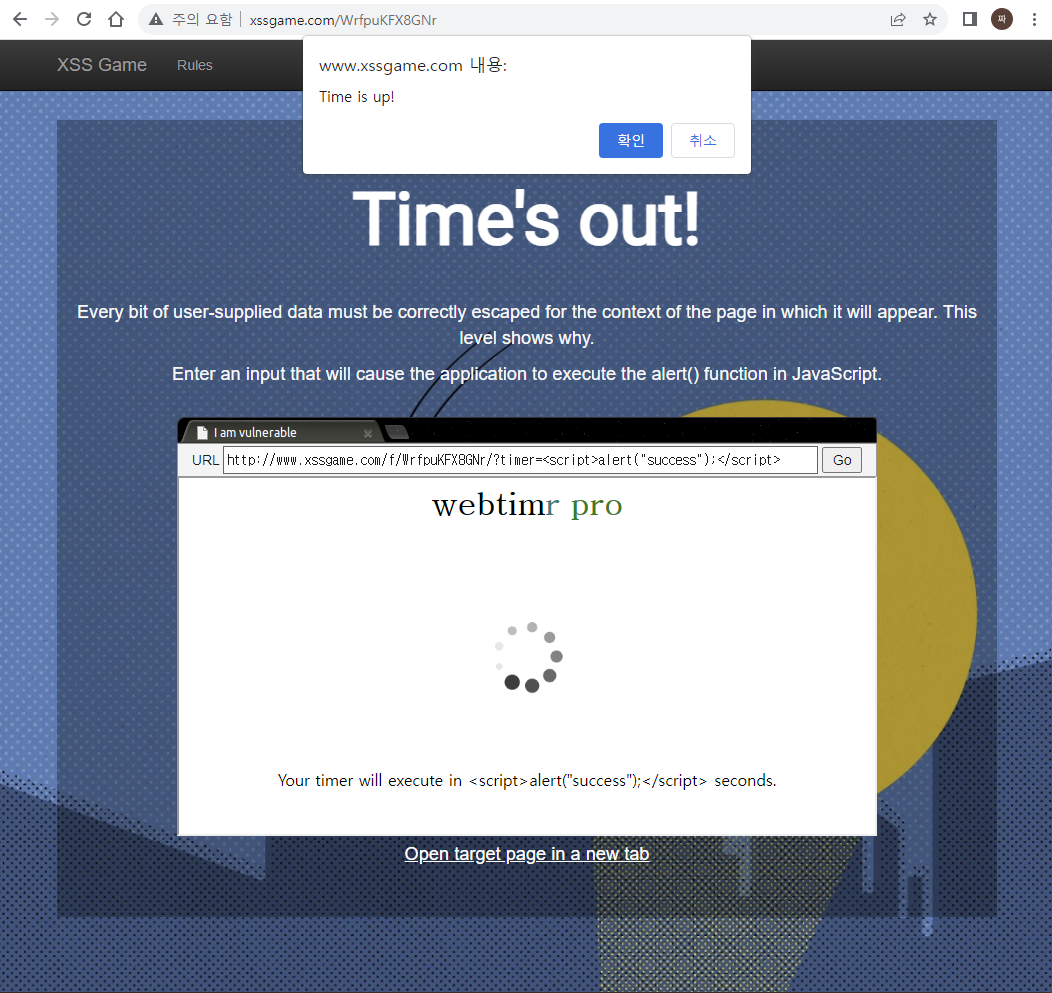 1에서 입력했던 것처럼 alert를 입력하면 아래와 같은 창이 뜨며 실패하는 것을 확인할 수 있다.