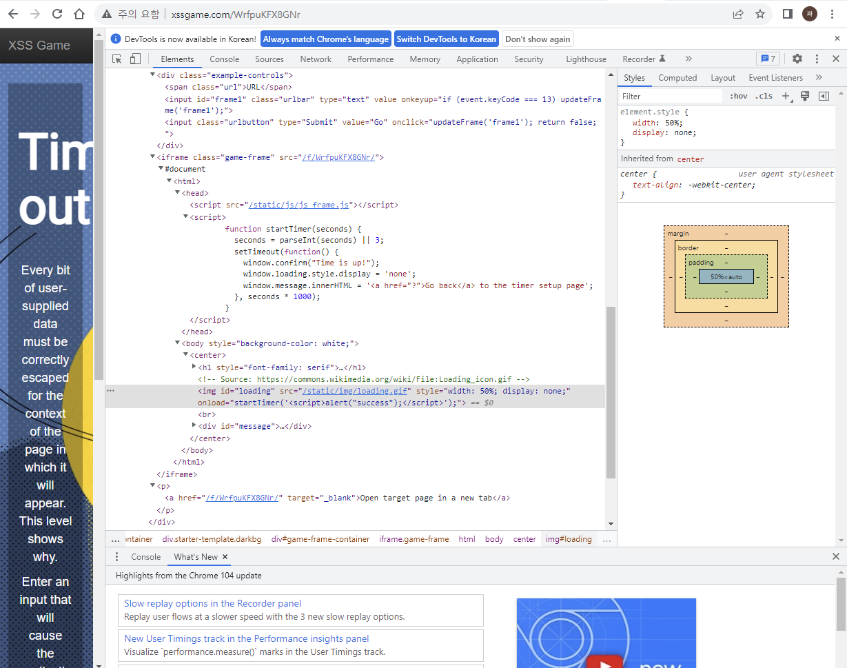 오른쪽 마우스를 클릭하여 검사를 하면, 아래의 코드에서 onload="startTimer('') 형식으로 입력값이 사용되는 것을 확인할 수 있다.