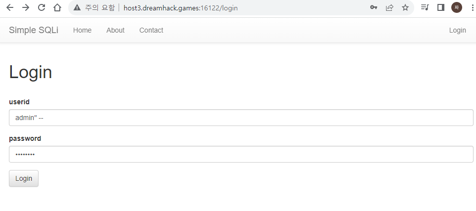 문제에 있는 http://host3.dreamhack.games:19679/ 링크로 이동하면 아래와 같은 로그인 창을 확인할 수 있다.
