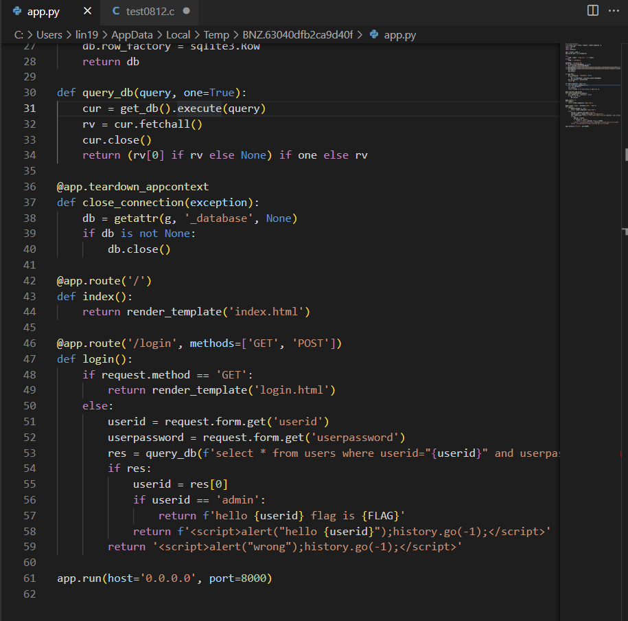 로그인 서비스입니다. SQL INJECTION 취약점을 통해 플래그를 획득하세요. 플래그는 flag.txt, FLAG 변수에 있습니다. Reference Server-side Basic