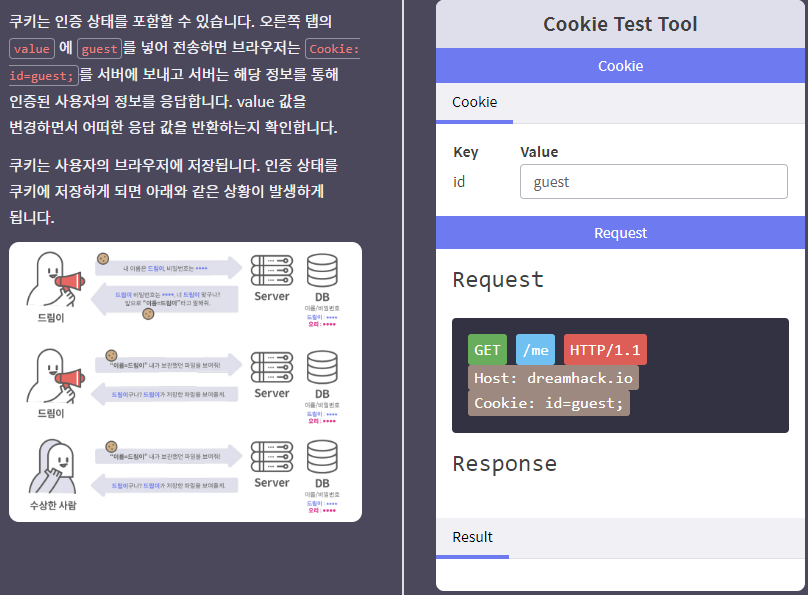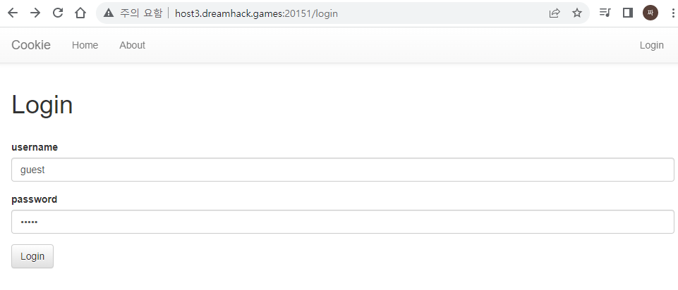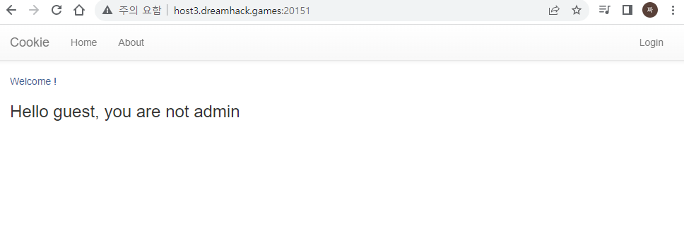 쿠키로 인증 상태를 관리하는 간단한 로그인 서비스입니다. admin 계정으로 로그인에 성공하면 플래그를 획득할 수 있습니다. Reference Introduction of Webhacking