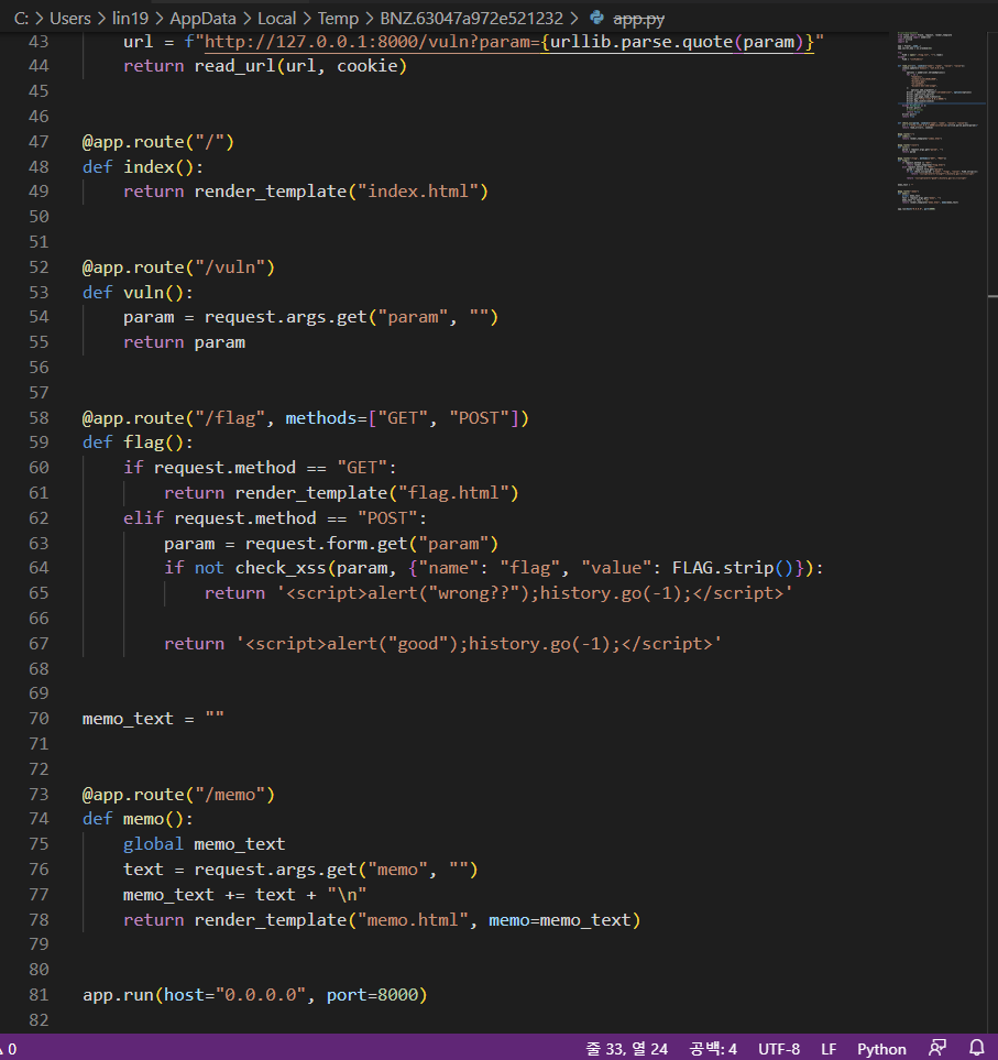 다운받은 파이썬 파일에서 check_xss 함수에서 입력한 URL을 참조한다는 것을 확인할 수 있다.
