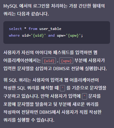 웹 애플리케이션에서 로그인/검색과 같이 사용자의 입력 데이터를 기반으로 데이터베이스(DBMS)에 저장된 정보를 조회하는 기능을 구현하기 위해 SQL쿼리에 사용자의 입력 데이터를 추가하여 DBMS에 요청한다. 이 과정에서 사용자의 입력이 SQL 쿼리에 삽입되어 SQL 구문으로 해석되거나 문법적으로 조작하게 되면 개발자가 의도한 정상적인 SQL 쿼리가 아닌 임의의 쿼리가 실행될 수 있다.