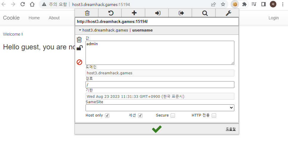 퍼즐처럼 생긴 걸 누르고 쿠키를 클릭하면 guest로 표시되어 있는 것을 확인할 수 있는데, 거기에 admin의 password인 flag를 알아야 하기 때문에 admin이라고 변경한 후 초록색 확인표시를 누르고 창을 새로고침한다.