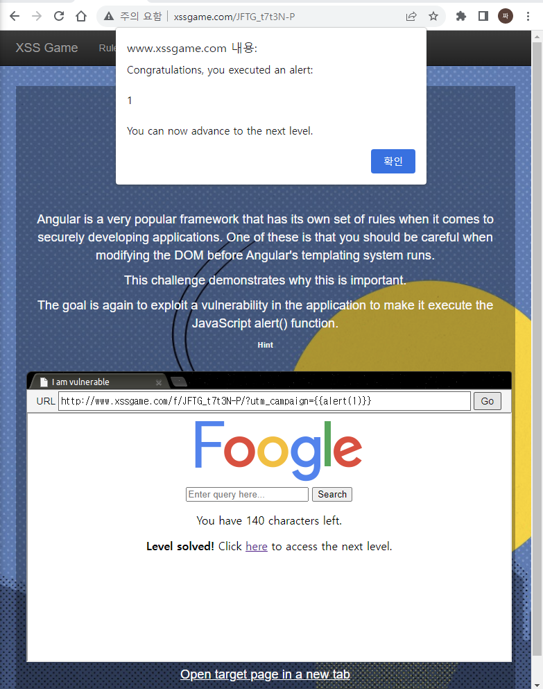 alert() 함수를 사용하여 출력하기 위해 http://www.xssgame.com/f/JFTG_t7t3N-P/?utm_campaign={{alert(1)}} 를 주소창에 입력하면 아래와 같은 창이 뜨는 것을 확인할 수 있다.