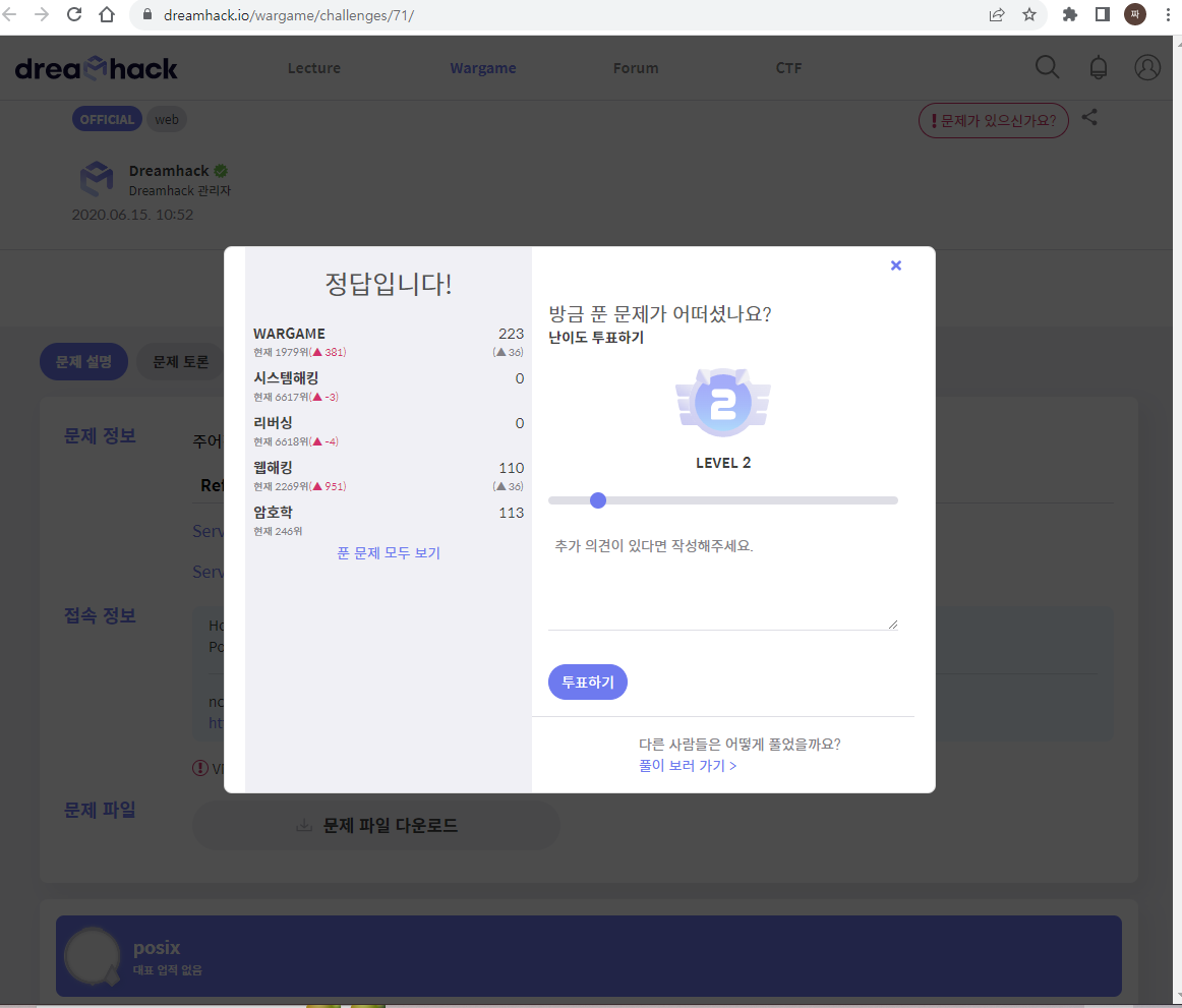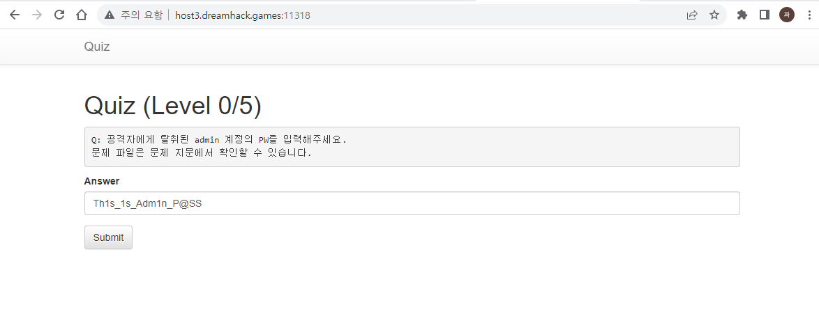 답을 입력하면 다음 레벨로 넘어가는 것을 확인할 수 있다.