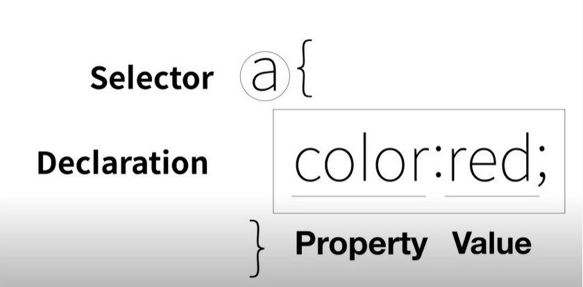 - color:red; : 선택자가 지정하는 태그들에 대해서 어떤 효과를 줄 것인가에 해당되는 것, 선언(효과, declaration)이라고 부름