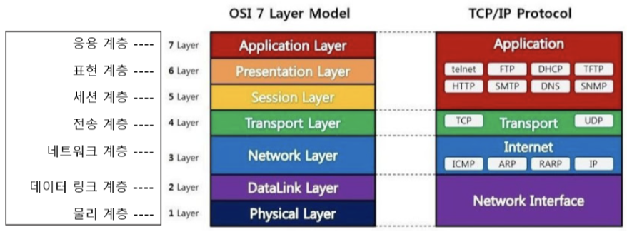 - OSI 7 계층은 응용, 표현, 세션, 전송, 네트워크, 데이터링크, 물리계층으로 나뉜다.