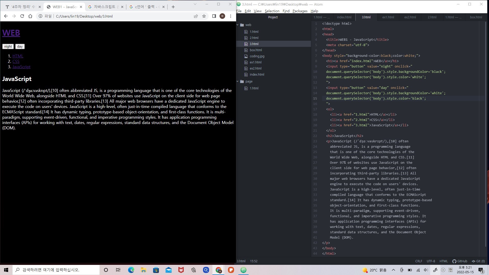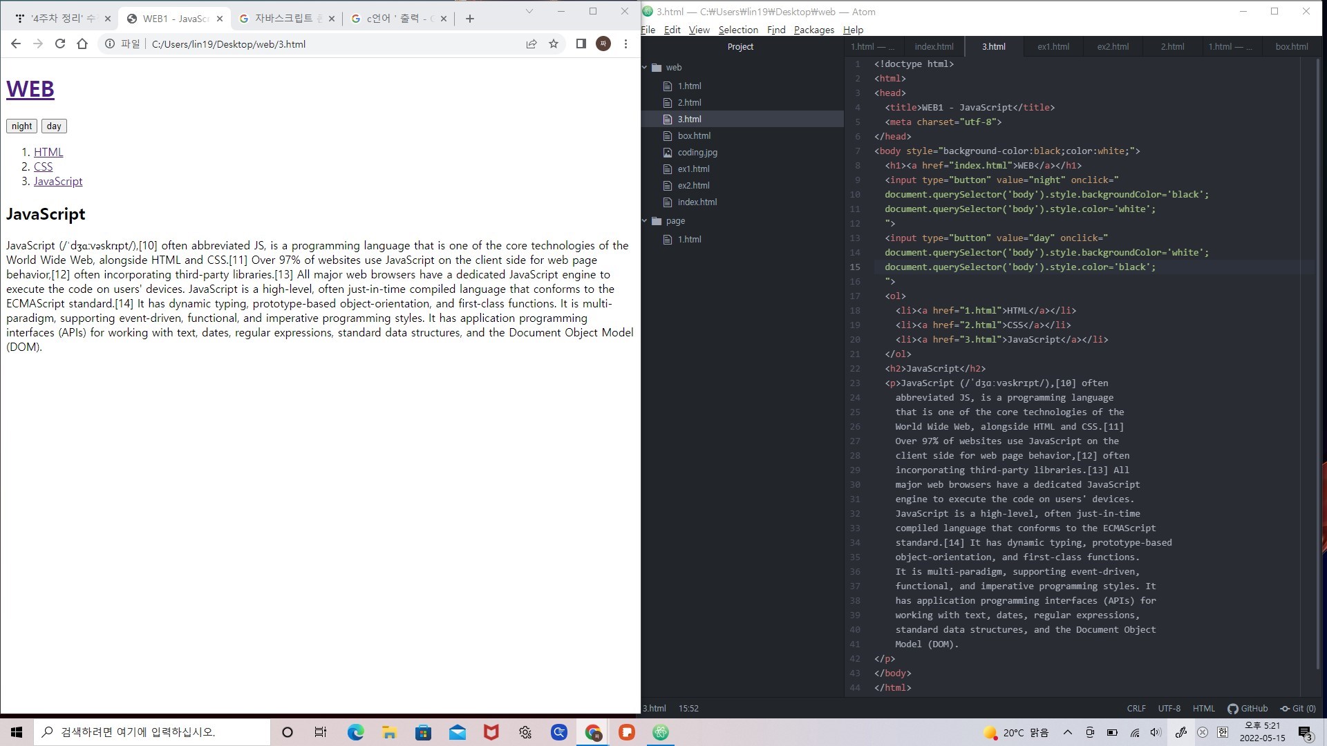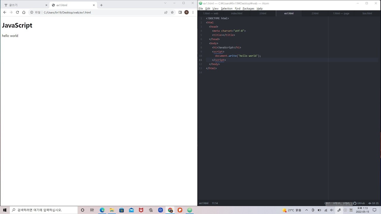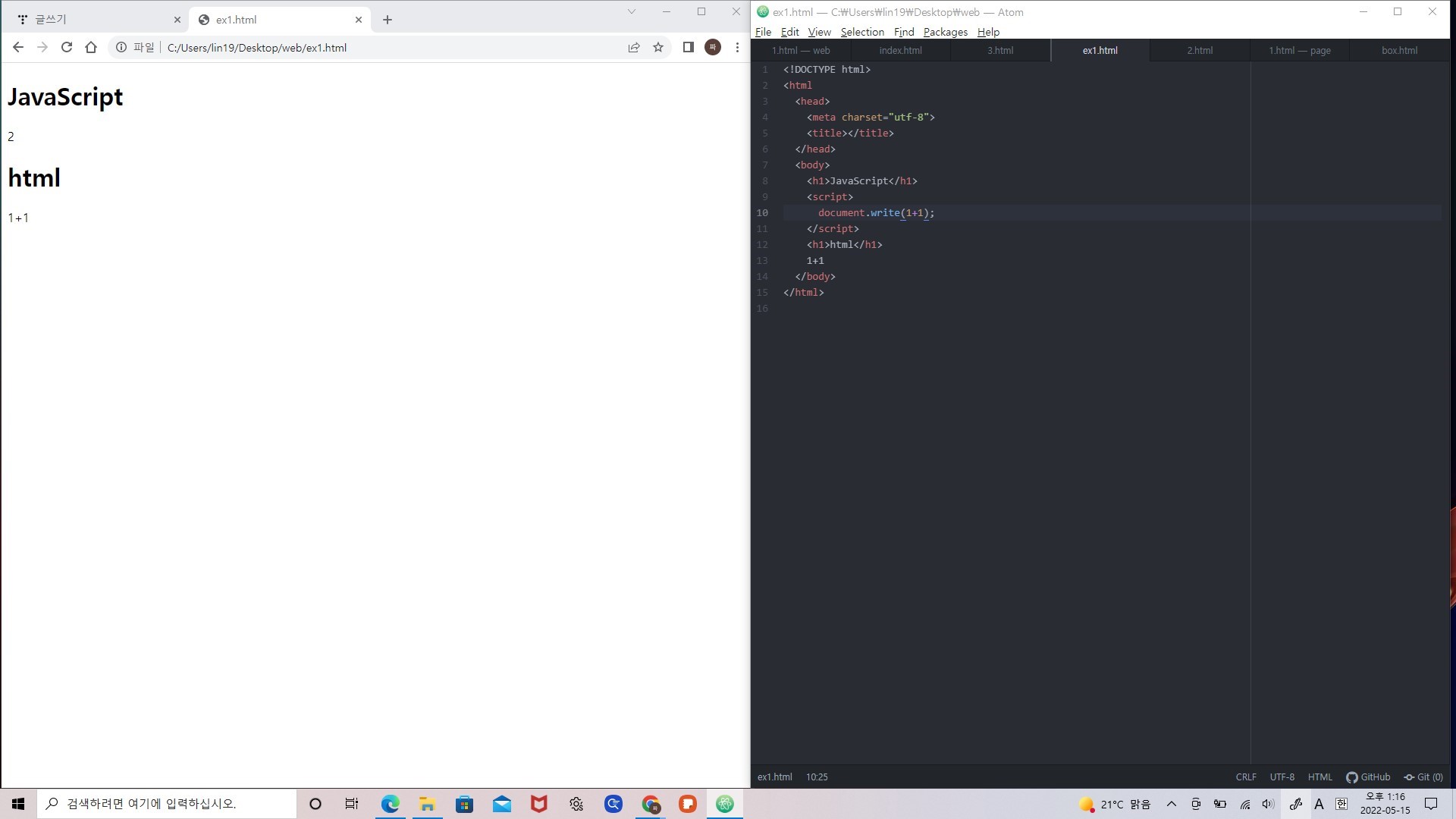 - html은 정적이라 1+1을 작성하면 그대로 1+1이출력되지만, javascript는 동적이라 계산기 역할을 해서 1+1을 하면 2가 출력됨