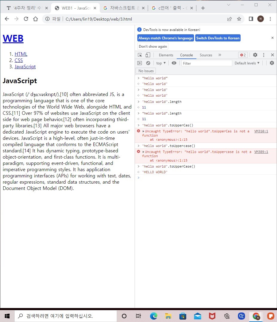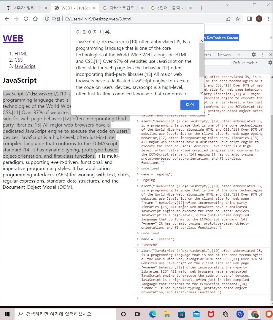 - 전체를 alert()로 감싸기 ex) alert('abcdefg'.length)