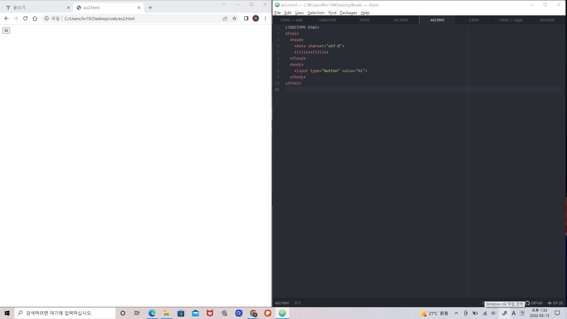 - <input>태그 사용할 때, 글씨를 쓰고 싶으면 value 속성 값 사용하기 ex) <input type="button" value="hi">