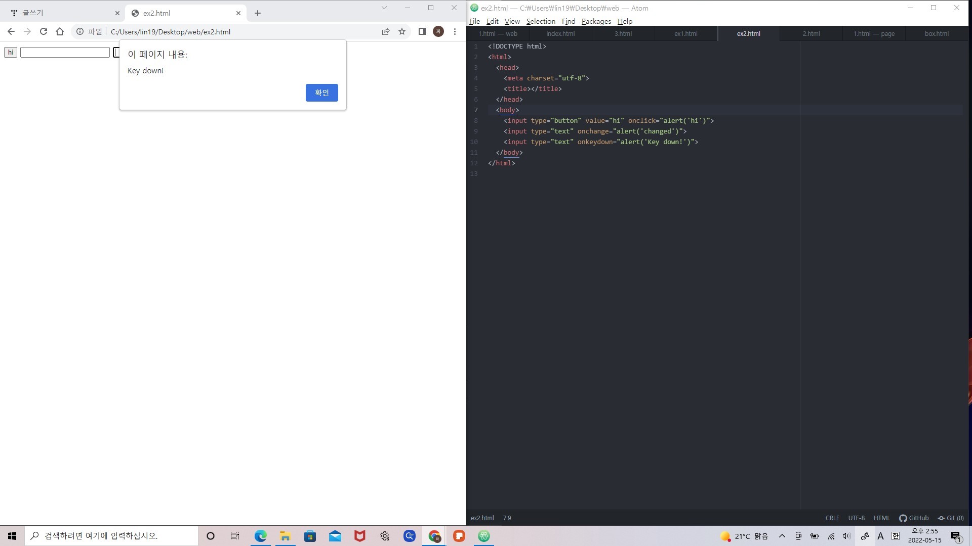 - 사용자가 어떤 키를 눌렀을 때 이벤트가 발생하게 하는 속성 : onkeydown="alert(' ')"
