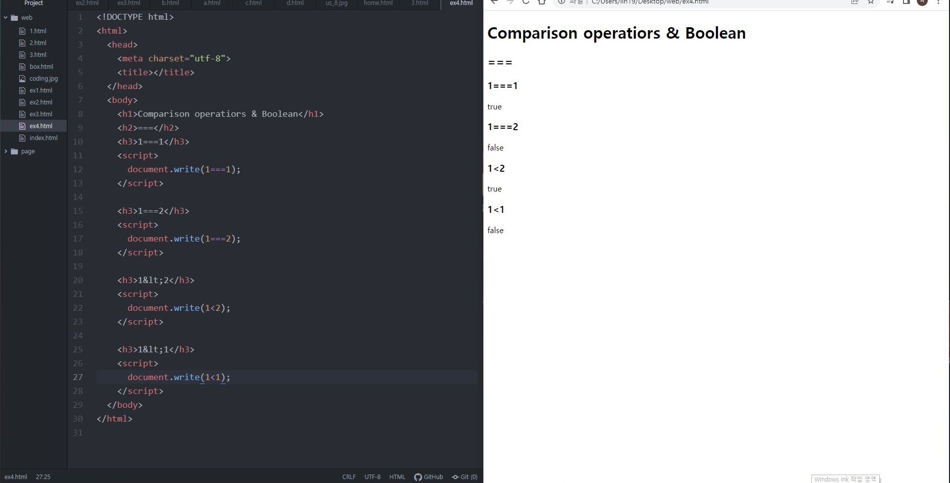 - 위의 비교 연산자를 통해 만들어지는 true, false 값