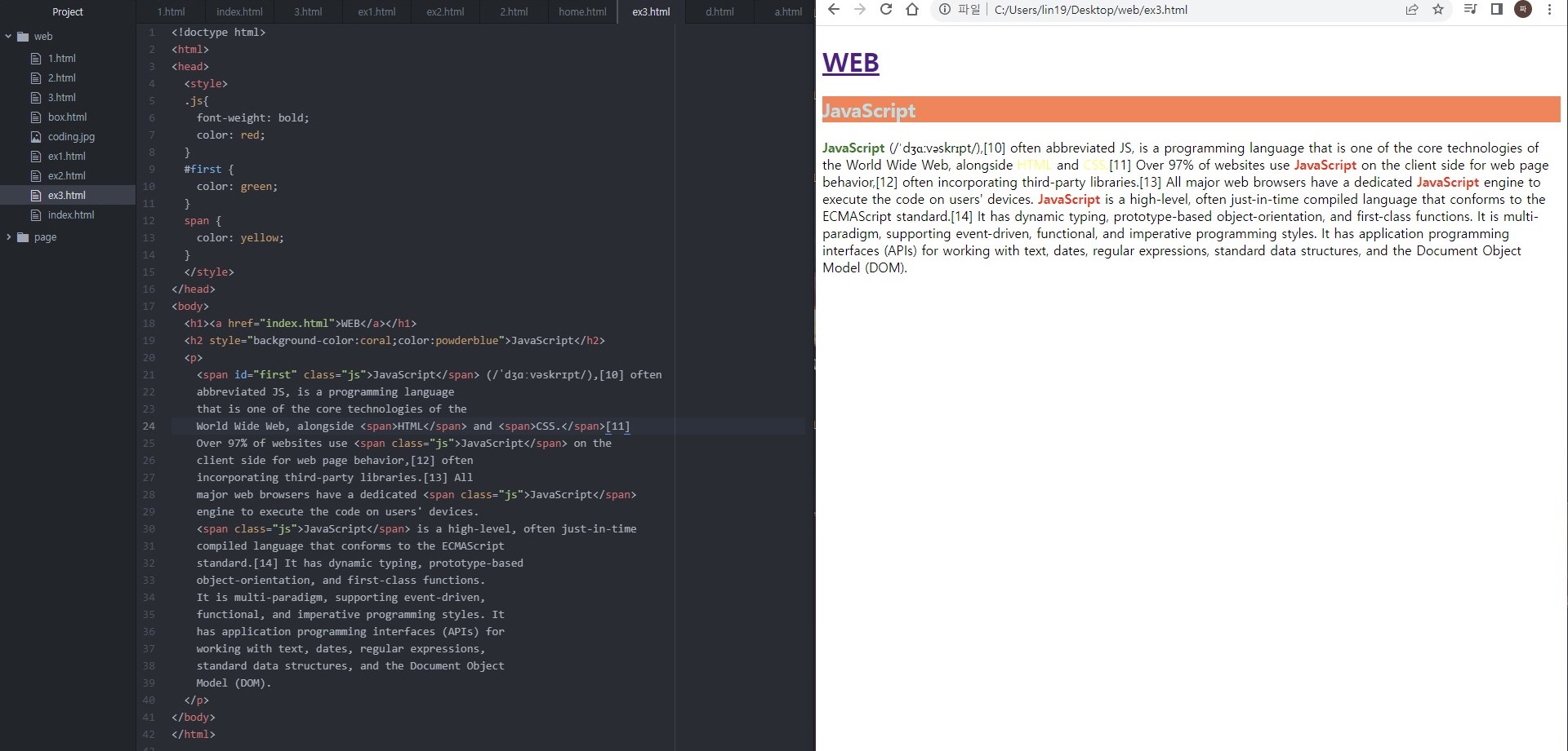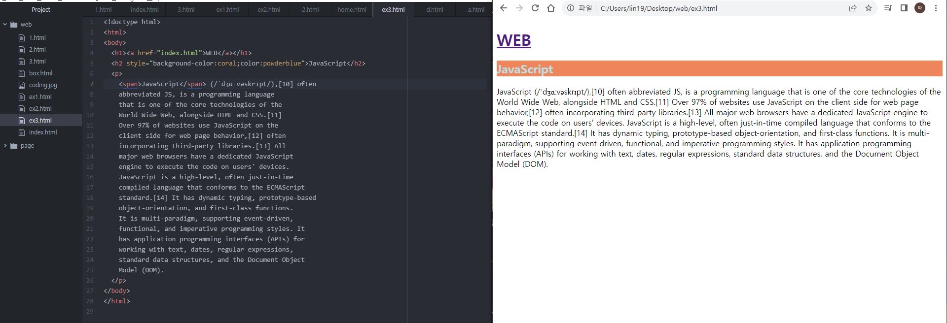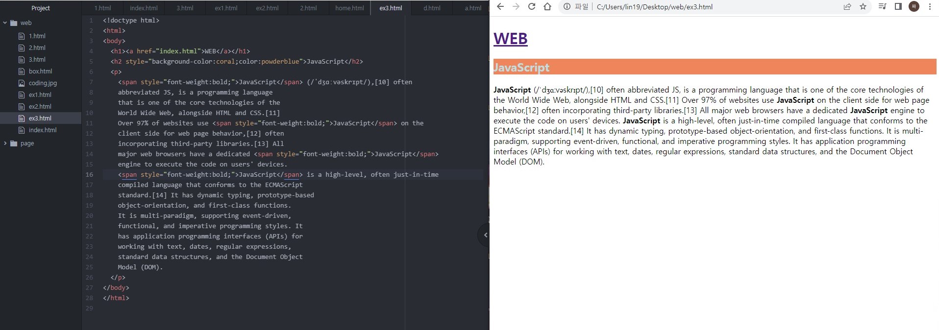 - 글자 두께를 두껍게 하는 style 속성 -> 강조 표시 : <span style="font-weight:bold;">JavaScript</span>