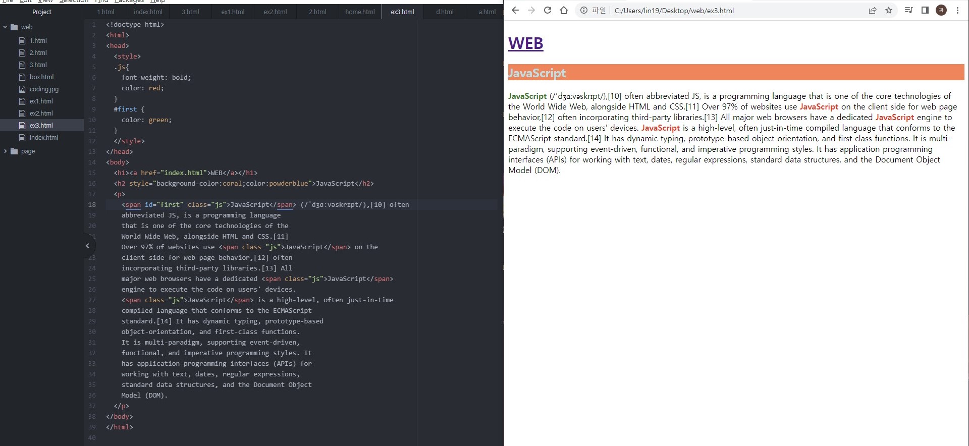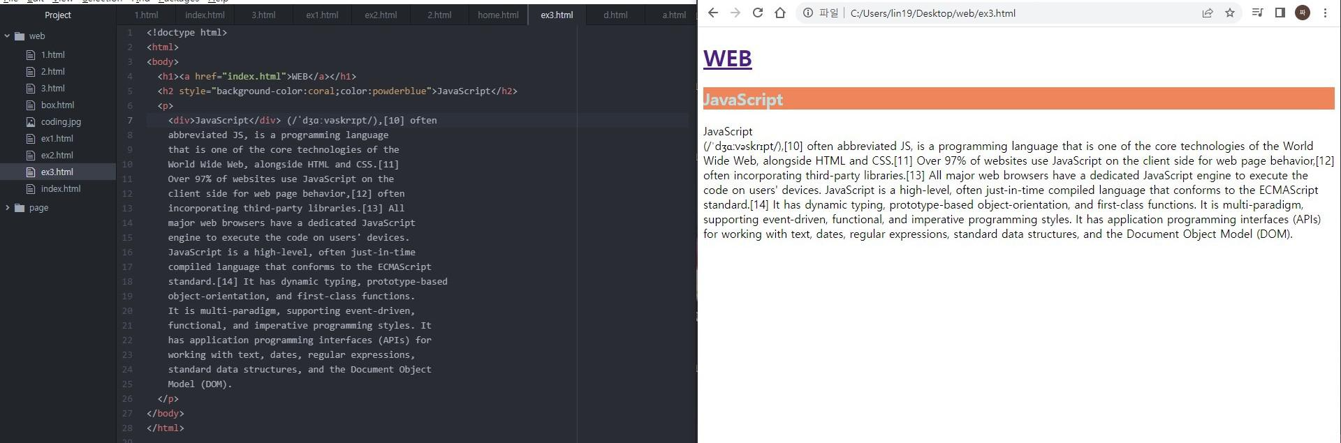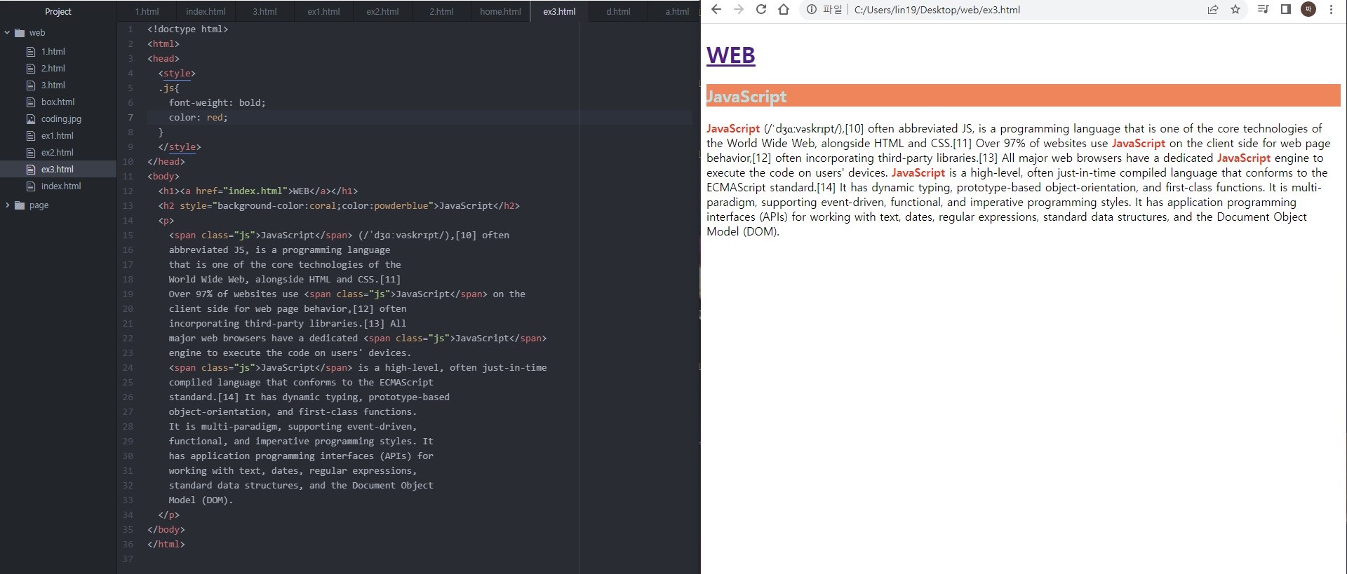 - 글자 두께를 두껍게 하는 style 속성 -> 강조 표시 : <span style="font-weight:bold;">JavaScript</span>