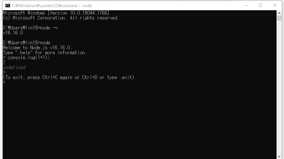 여기서 나갈 때는 Ctrl+C를 두 번 누르거나(컨트롤키를 누른 상태로 c를 두 번 누르기) .exit을 누르면 나각게 된다.