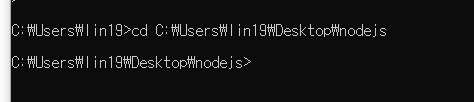 cd C:\Users\lin19\Desktop\nodejs명령어를 입력한다. 명령어를 복사 붙여넣기할 때는 오른쪽 마우스를 누르면, 붙여넣기가 된다. 이 명령어를 입력하면 C:\Users\lin19\Desktop\nodejs로 이동하게 된다.