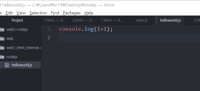 그리고 nodejs에 helloworld.js파일을 만들고, console.log(1+1);을 입력한다.