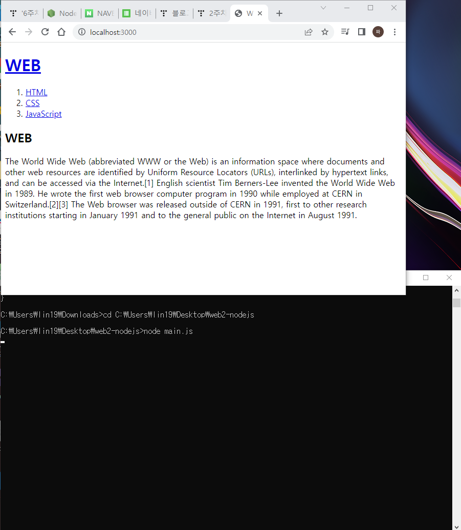 cmd창에 "cd C:\Users\lin19\Desktop\web2-nodejs"명령어를 입력해서 C:\Users\lin19\Desktop\web2-nodejs 디렉토리로