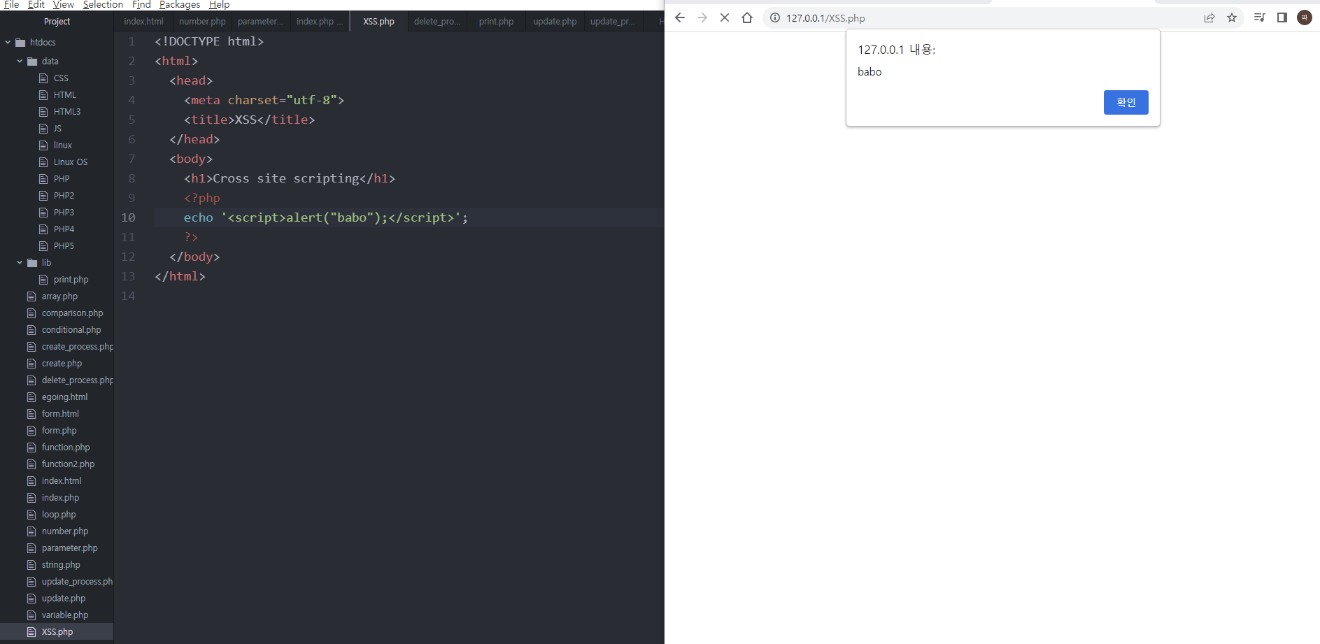 스크립트 태그는 자바스크립트라는 컴퓨터 언어를 웹브라우저에서 실행한 코드이다. 크로스 사이트 스크립트는 정보를 유출하는 문제가 생길 수 있기 때문에 매우 위험하다.