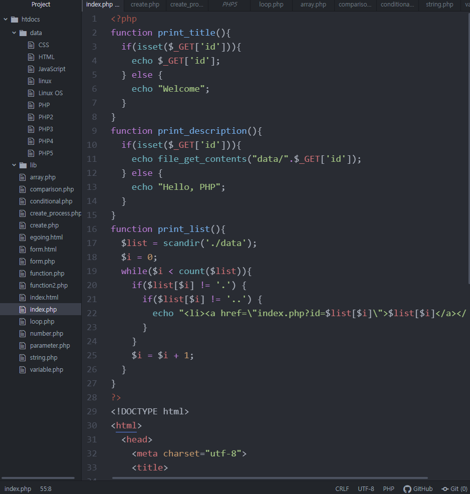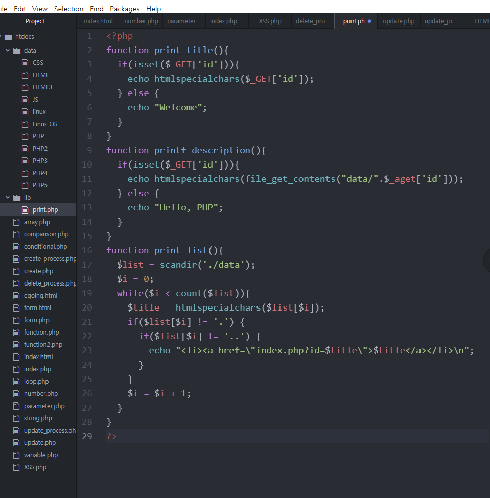 그러나 이렇게 require()를 사용하다 보면 작성된 코드에 있는 함수들의 인과관계가 드러나지 않는다는 문제가 있다. 그렇기 때문에 lib안의 print.php파일에도 require()를 이용해 함수 사이의 인과관계 나타내야 한다.
