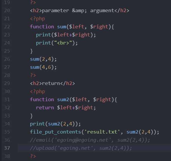 여기서 function sum에 사용되는 $left와 $right라고 하는 변수가 parameter, 매개변수라고 한다.