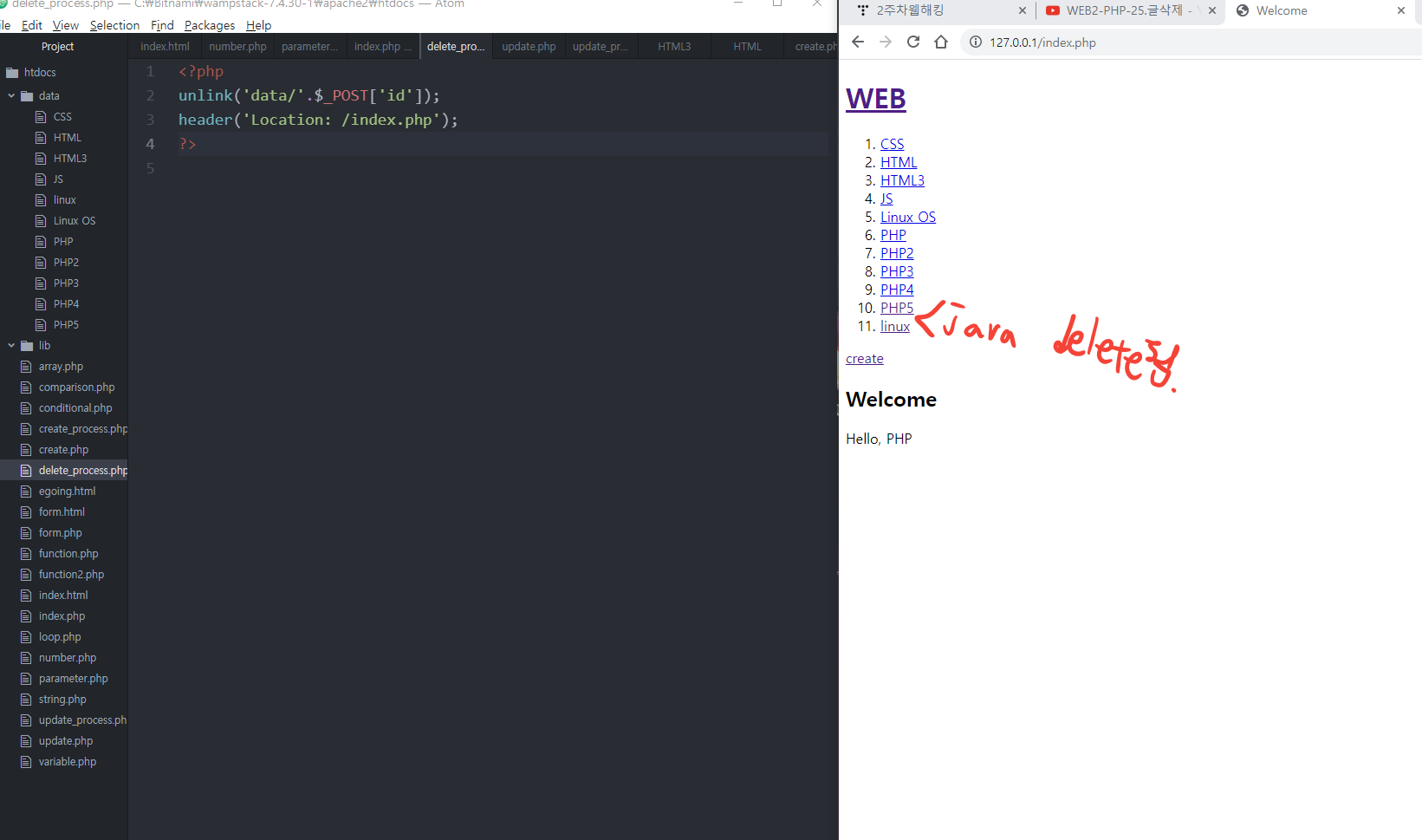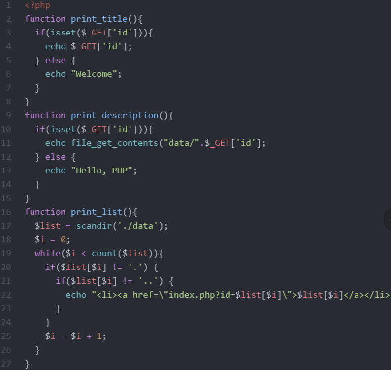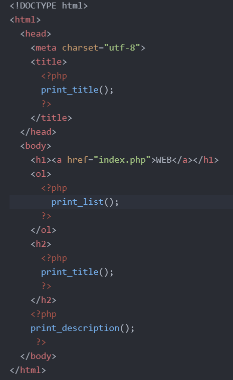 원래 있던 파일의 코드를 lib안의 print.php파일로 옮겨놓고, 그 코드에 "lib 안의 print.php파일에 이 코드가 있다"고 표시하는 명령어인 require()를 사용한다.